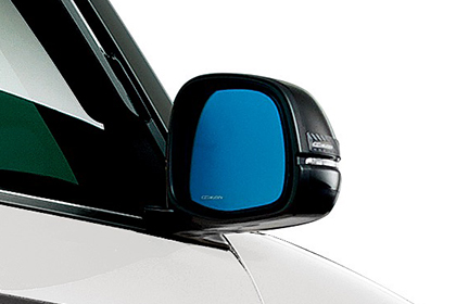 多層膜コーティングを施したブルー色鏡面が紫外線や太陽光の眩しさを軽減するとともに夜間走行時には防眩効果を高め目の疲労を軽減。また、光触媒技術を利用した親水コートを施すことにより付着した水を膜状に拡散することで雨天時の視界を確保。さらに、曲率をR側、L側共に800Rとすることでワイドな後方視界を確保。ノーマルミラー貼り付けタイプ。無限ロゴ入り。