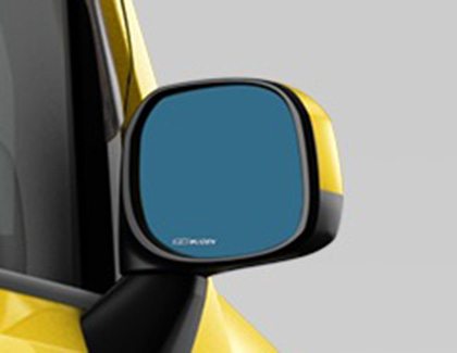 標準装備ドアミラーに貼り付けタイプの親水性広角ブルーミラー。多層膜コーティングを施したブルー色鏡面が太陽光や夜間走行時の防眩効果を高め目の疲労を軽減。また、光触媒技術を利用した親水コートにより付着した水を膜状に拡散し雨天時の視界を確保。さらに曲率をR側、L側ともに1000Rとすることでワイドな後方視界を確保。無限ロゴをレーザー印。