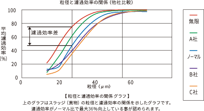 エンジン内部で発生するスラッジ(異物)を可能な限り除去する為に濾材面積、濾材収納形状などを最適化する事により圧力損失は最大10%向上(ノーマル比)。さらに濾材繊維をY字断面とした濾材を採用した事によりスラッジ(異物)を効率良く除去し、エンジン内部の磨耗を防止。また、高耐熱性のあるアクリルゴム(ガスケット)やシリコンゴム(アンチドレン)を使用したことにより高油温条件にも対応。