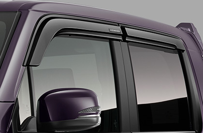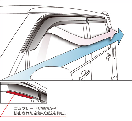 一般的なドアバイザーの場合、ウインドウを少し下げた状態で使用すると、開口前部から排出された空気が渦流となり開口後部から再び室内へと逆流する傾向にある。ベンチレーテッドバイザーは、フロントバイザー本体下端に装備されているゴムブレードにより、ウインドウを少し下げた状態※でもバイザー後方は閉じられた状態とし、開口部位を前方に限定することで室内から排出された空気の逆流を抑止する。さらに走行時に発生する負圧により、空気の排出を効率的に促す。また、ウインドウ開口時に浸入しがちの雨滴や他車が跳ね上げた雨水の浸入を防ぐなど、バイザーとしての利用快適性を大幅に向上させている。スモークタイプのアクリル製。