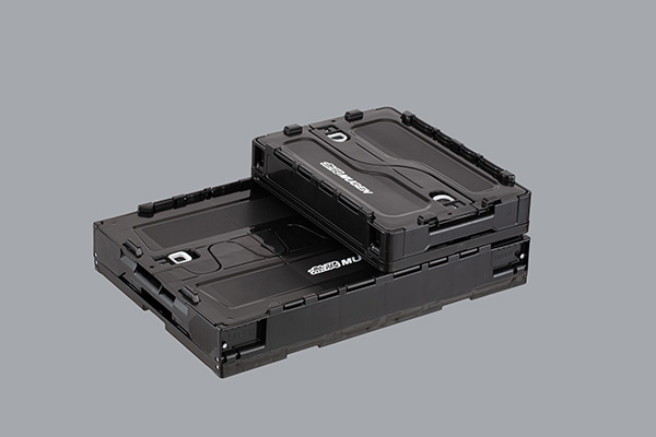 コーポレートカラー3色とロゴを大胆かつシンプルに配置した「無限折りたたみコンテナ」。50 ℓのMサイズと20ℓのSサイズの2タイプを用意。SサイズはMサイズの上に2個並べて積み重ねることが可能。
