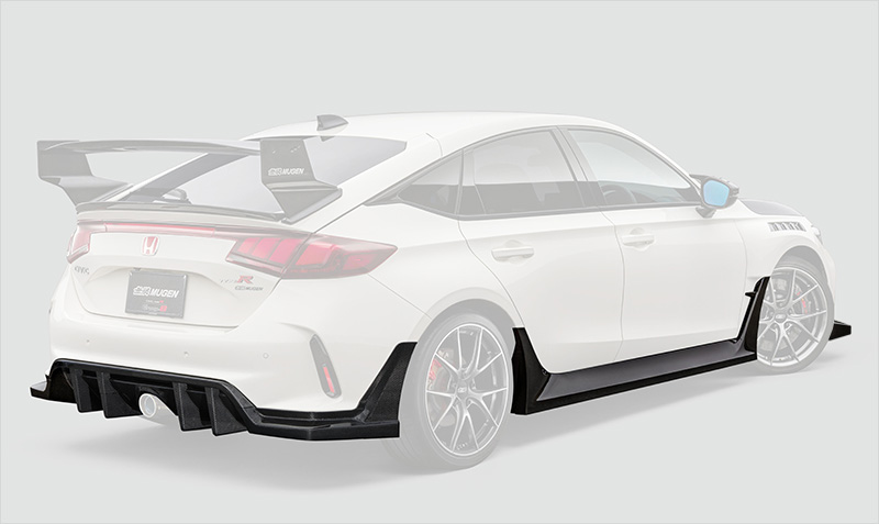 空力解析のもと最適なディフューザー形状を設定。車体下部からの気流を整え、ダウンフォースを増大させるカーボンリアバンパーディフューザー。またディフューザー上部に開口部を設けることでリアバンパー内部に滞留する空気を後方へ放出、空気抵抗を低減。無限スポーツエキゾーストシステム同時装着専用設計。標準リアアンダースポイラーより約22mmダウン。CFRP製。