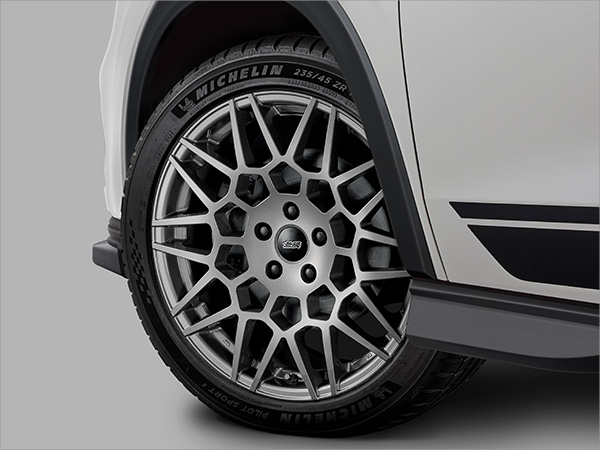五角形を基調としたメッシュタイプの19インチアルミホイール「CU20」。ガンメタリックカラーが陰影を深め、幾何学パターンの造形を際立たせる。サイズは19×8.5Jインセット50。専用ホイールナットは別売り。推奨タイヤサイズは235/45R19 95W/Y。
