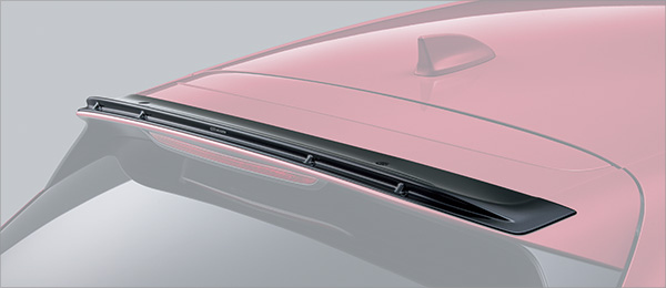 標準装備のテールゲートスポイラー上部に装着するガーニーフラップ。エアロを装着した状態での前後のバランスを考え空力解析を行い開発し、ダウンフォースを発生させることでリアの接地感の向上に寄与。いずれのボディカラーもクリスタルブラック・パールの装着を推奨。真空成型のPPE製。